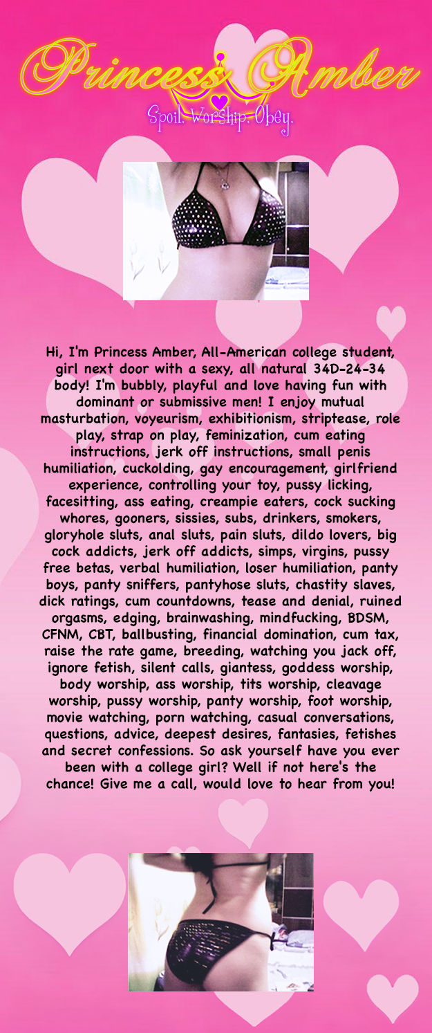 See more models from Princess Amber's tags: striptease / roleplay / taboo / pussy / teen / femdom / findom / joi / cei / sissy / masturbation / sph / humiliation / gfe / cuckolding / strapon / edging / blackmail / ballbusting / cbt