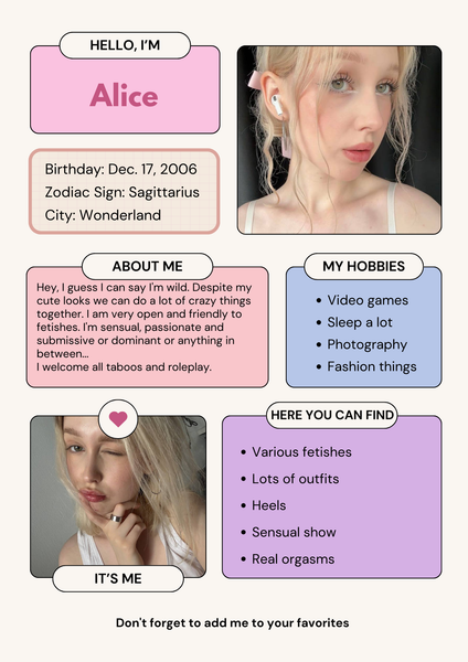 So my name is Alice I am 19 years old I am the most ordinary girl from Latvia and just decided to hang out with you here guys. I am an architect and my biggest dream is to travel around the world and study the architecture of buildings of different countries. My favorite is Paris.